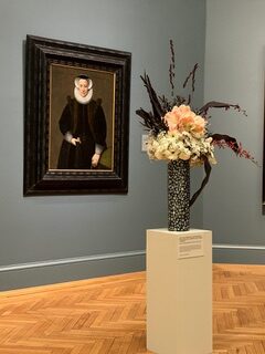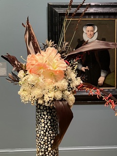 Drawing from the painting’s atmosphere and detail, the arrangement echoes the portrait’s austere elegance. Deep, dramatic tones reflect the painting’s dark background and the sitter’s composed, almost severe expression. At the center of the floral design, a structured radial collar of delicate, lace-like blooms evokes the ornate ruff worn by the woman in the portrait—capturing a sense of restraint, refinement, and quiet strength.